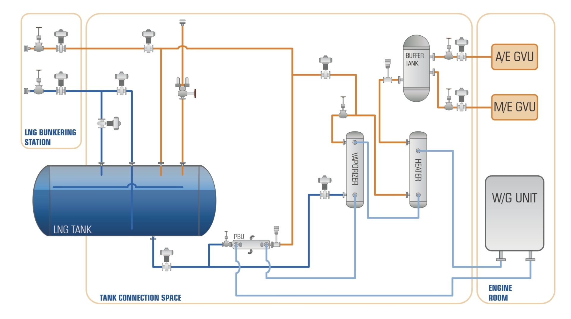 整個氣體工藝包采用定制化開發(fā)/模塊化設計,可根據(jù)船舶布置實現(xiàn)布局的最優(yōu)化。天然氣經(jīng)中間介質加熱,降低天然氣與熱源之間的交叉泄漏風險,同時確保在不同航區(qū)不同環(huán)境條件下供氣系統(tǒng)和加熱單元的靈活性和穩(wěn)定性。