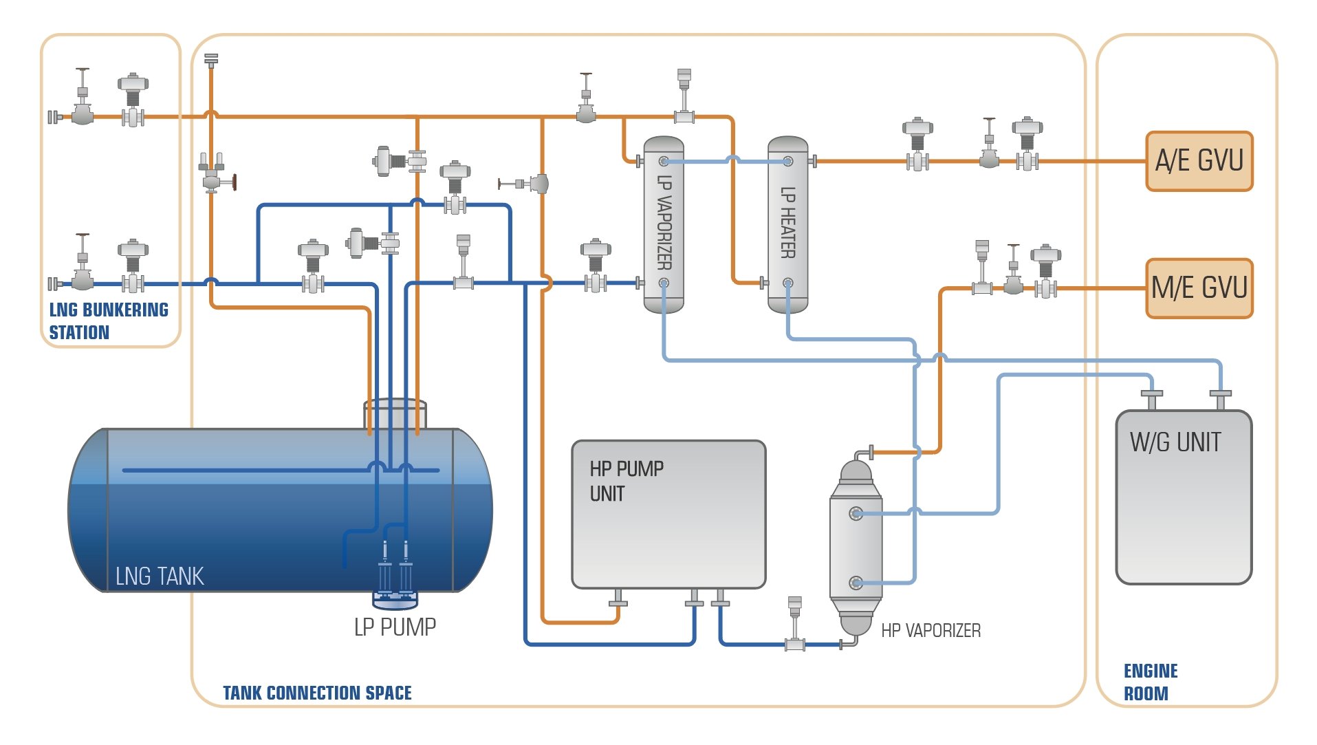 海洋衛(wèi)士?船用LNG供氣系統(tǒng)為客戶提供一站式的完整解決方案,系統(tǒng)集成范圍包括燃料加注、燃氣儲存、燃氣處理、進機前調(diào)節(jié)等主要配置,以及氮氣吹掃、輔助加熱、干粉消防等供氣輔助系統(tǒng)。